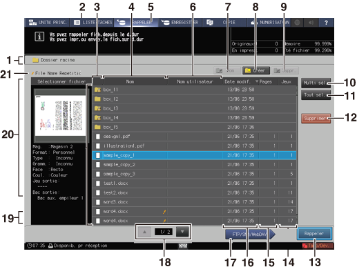 10 | [Multi sél.] | Appuyez dessus avant de sélectionner dans la liste plusieurs tâches enregistrées sur le disque dur. Appuyez dessus, puis sélectionnez les tâches en appuyant dessus dans la liste. Appuyez à nouveau sur [Multi sél.] pour annuler cette fonction. Vous ne pouvez pas sélectionner les dossiers ou boîtes utilisateur affiché(s). |