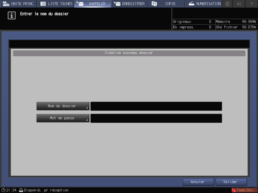Entrez un nom de dossier et un mot de passe, puis appuyez sur [Valider].