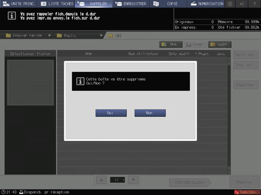 Supprimez toutes les tâches de la boîte utilisateur et appuyez sur [Suppr.].