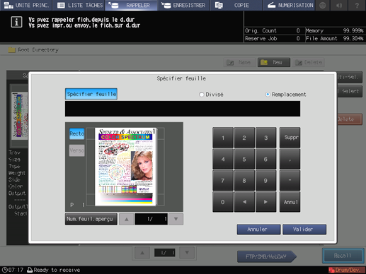 Sort la feuille spécifiée en mettant en attente les bons de travail existants. En spécifiant un [Tampon/N° de page], vous réaffectez la feuille spécifiée.
