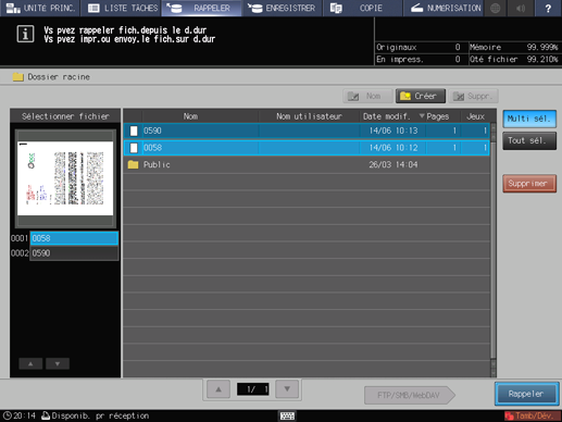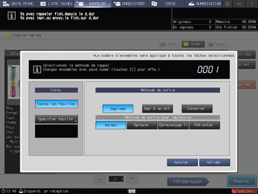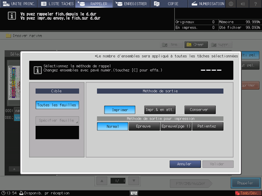 La fonction [RAPPELER] d'une tâche enregistrée sur le disque dur permet d'imprimer ou de mettre la tâche en attente ou les deux simultanément. Vous pouvez aussi sélectionner le type de sortie pour l'impression de la tâche.