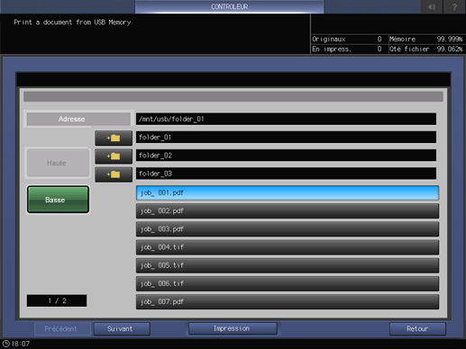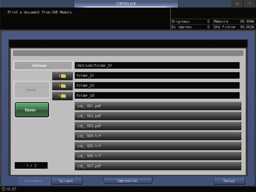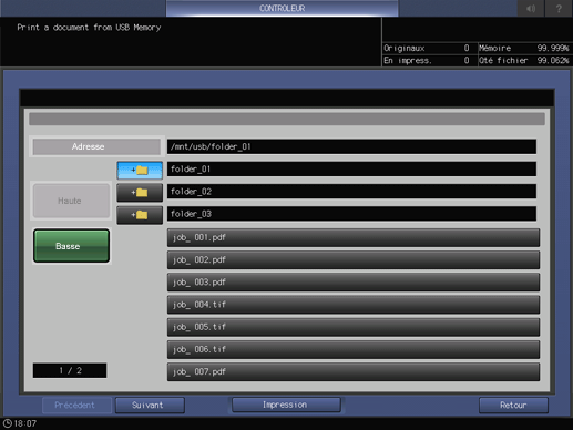 Pour se déplacer entre les dossiers de la mémoire USB, sélectionnez un dossier et pressez [Basse] ou [Haute].