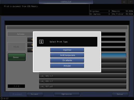 Si [USB Flash Drive] n'est pas affiché, réglez [Impr.dir.péri.USB] sur [Autoriser] dans le menu Utilitaires. Pour en savoir plus, voir Configuration d'inhibition de fonction : interdiction des fonctions machine.