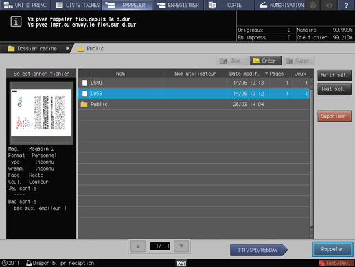 L'écran [Dossier racine] de l'écran [RAPPELER] s'affiche.