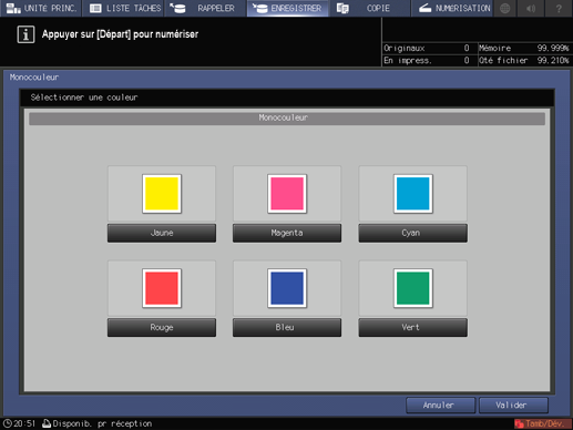 Copie monochrome dans une des 6 couleurs [Jaune], [Magenta], [Cyan], [Rouge], [Bleu] et [Vert].