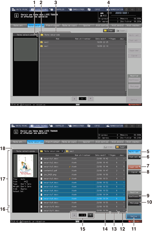6 | [Tout sél.] | Appuyez dessus pour sélectionner toutes les tâches sécurisées dans la seconde couche. Appuyez sur [Multi sél.] pour annuler cette fonction. |