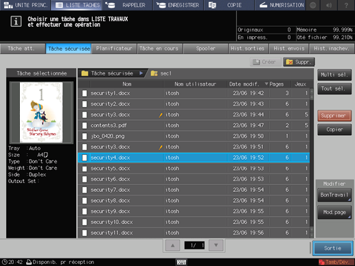 Les travaux d'impression consignés dans la boîte sécurisée s'affichent.