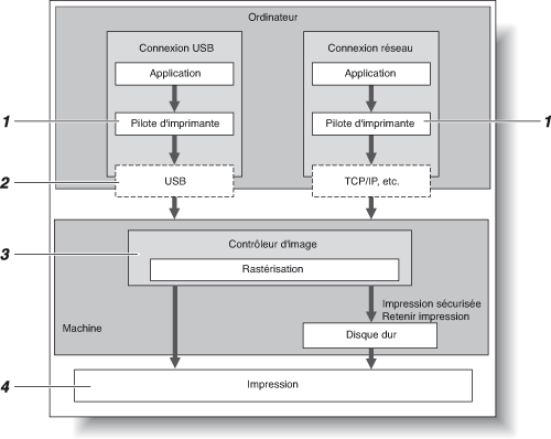 Les données sont envoyées au contrôleur d'image via l'interface USB en cas de connexion USB ou via Ethernet (TCP/IP, etc.) en cas de connexion réseau. Les données sont ensuite transmises à la machine par le contrôleur d'image.