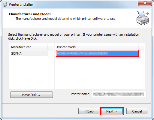 Sélectionnez le modèle d'imprimante et cliquez sur [Suivant].