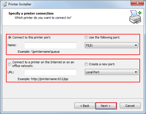 Vous pouvez spécifier l'autre connexion imprimante (NetBIOS ou port 9100).