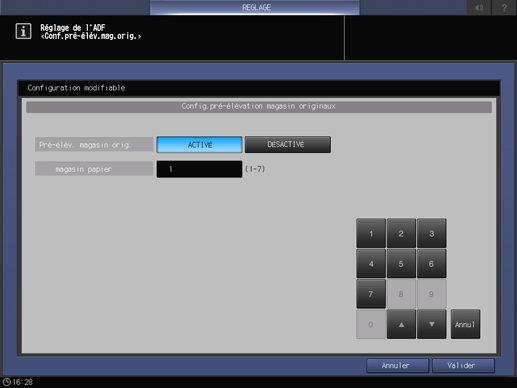 Si [ACTIVÉ] est sélectionné dans [Pré-élév. magasin orig.], entrez la valeur de réglage de [magasin papier] sur le clavier de l'écran tactile ou [][
