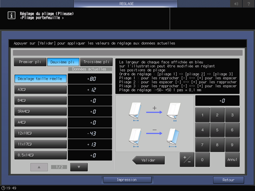 Sélectionnez [Pliage 2] et utilisez le clavier de l'écran tactile pour entrer la valeur de réglage.