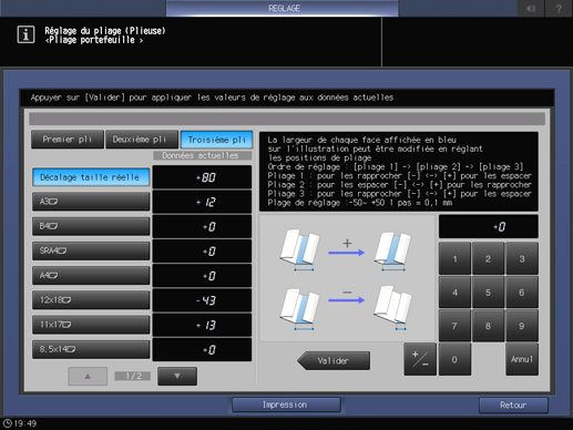 Sélectionnez [Pliage 3] et utilisez le clavier de l'écran tactile pour entrer la valeur de réglage.
