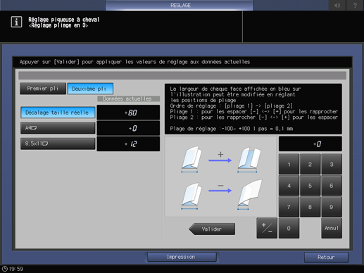 Sélectionnez [Pliage 2] et utilisez le clavier de l'écran tactile pour entrer la valeur de réglage.