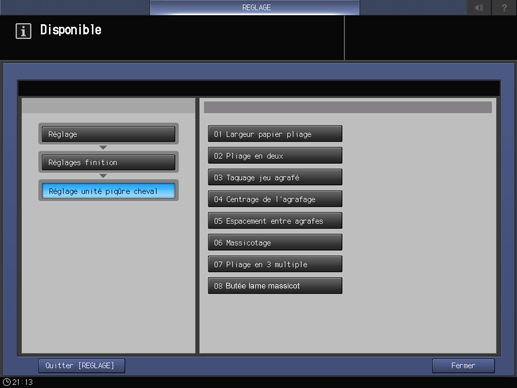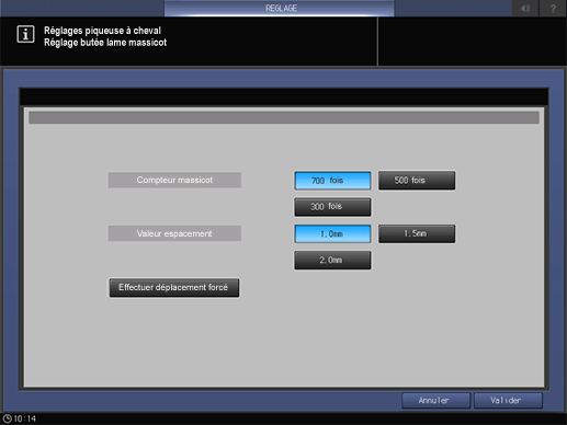 2. Appuyez successivement sur [Réglages finition], [Réglage unité piqûre cheval] et [Butée lame massicot].