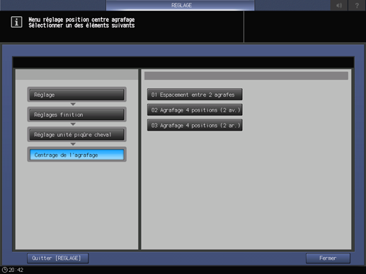 Appuyez consécutivement sur [Réglages finition], [Réglage unité piqûre cheval], [Centrage de l'agrafage] et [Agrafage 4 positions (2 ar.)].