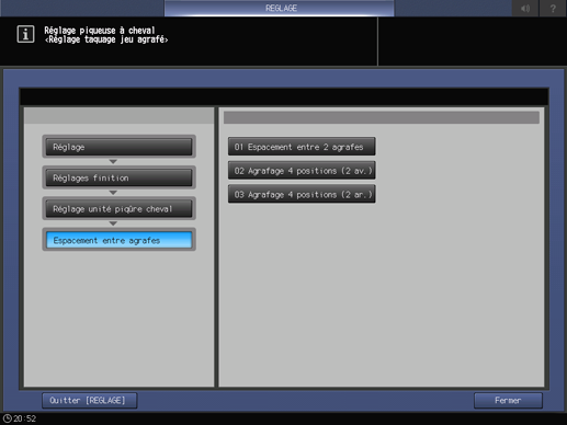 Appuyez consécutivement sur [Réglages finition], [Réglage unité piqûre cheval], [Espacement entre agrafes], et [Agrafage 4 positions (2 av.)].