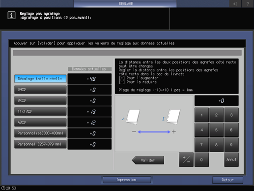 Si un réglage est nécessaire, appuyez sur [Retour réglage] pour revenir à l'écran [Réglage espacement agrafes].
