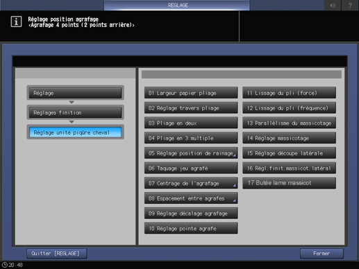 Appuyez successivement sur [Réglages finition], [Réglage unité piqûre cheval] et [Butée lame massicot].
