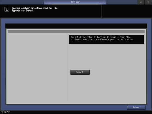 Appuyez consécutivement sur [Réglages finition], [Réglages perforation] et [Capteur détect. bord feuille].
