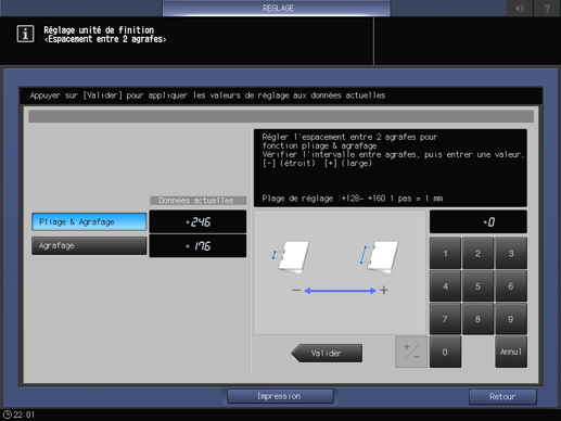 Si un réglage est nécessaire, appuyez sur [Retour réglage] pour revenir à l'écran [Espacement entre 2 agrafes].