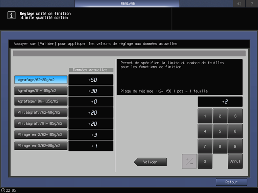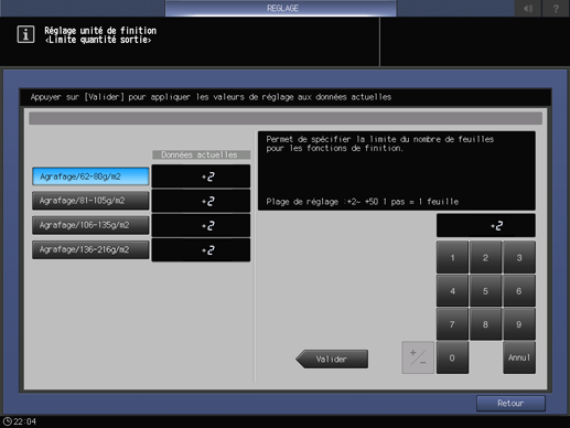 Plage de réglage : Agrafage / 62 à 80 g/m2 : +2 à +50 (1 pas = 1 feuille), Agrafage / 81 à 105 g/m2 : +2 à +40 (1 pas = 1 feuille), Agrafage / 106 à 135 g/m2 : +2 à +30 (1 pas = 1 feuille), Agrafage / 136 à 216 g/m2 : +2 à +20 (1 pas = 1 feuille)