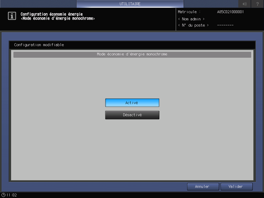 Appuyez consécutivement sur [Configuration système] sur l'écran [Menu Configuration utilisateur] et appuyez sur [Réglage économie énergie] et [Eco énergie monochrome].