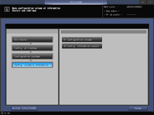 Appuyez consécutivement sur [Configuration système] sur l'écran [Menu Réglage utilisateur] et appuyez sur [Réglage volume & information] et [Sélection information sonore].