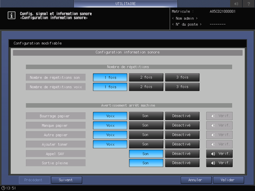 Spécifiez le nombre de répétitions du son ou de la voix qui retentit quand une tâche s'arrête par manque de papier ou suite à un bourrage ; spécifiez également le son individuellement pour des éléments donnés.