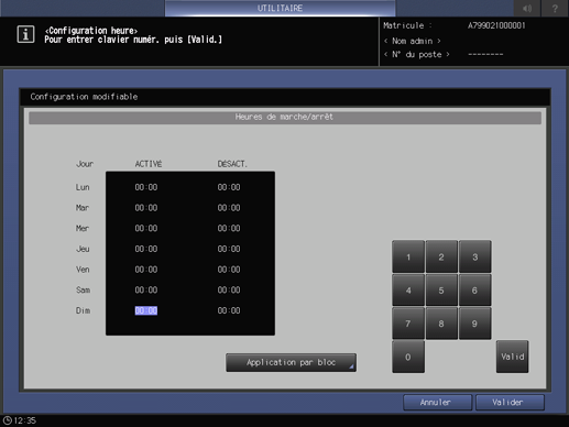 Utilisez le clavier de l'écran tactile ou le clavier du panneau de contrôle pour entrer les heures de marche/arrêt. Appuyez sur [Valider] pour décaler la zone mise en évidence.