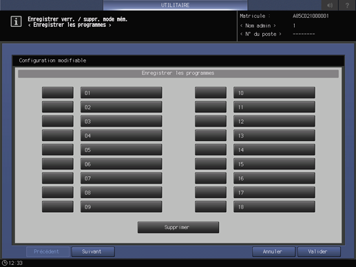 Appuyez sur l'onglet [Configuration système] de l'écran [Menu fonctions administrateur]. Appuyez consécutivement sur [Autorisation/Interdiction], [Programmes utilisateur] et [Enregistrer les programmes].