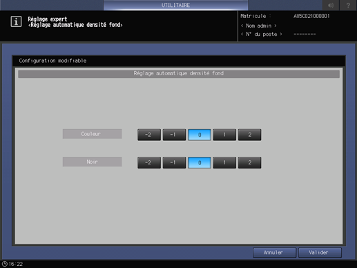 Appuyez sur l'onglet [Configuration système] de l'écran [Réglage administrateur], puis consécutivement sur [Réglages expert] et [Régl. Densité Fond Auto].