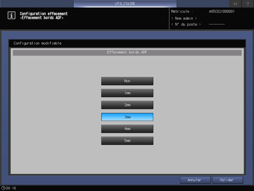 Appuyez sur [Configuration système] dans le [Menu Configuration administrateur] et appuyez consécutivement sur [Réglages expert], [Réglages effacement] et [Effacement bords ADF].