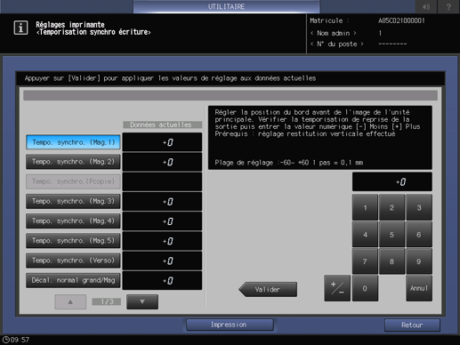 Cette opération est la même que celle effectuée dans [Réglage] - [Réglage machine] - [Réglages imprimante] - [Temporisat. synchro écriture], accessible sur l'écran [MACHINE].