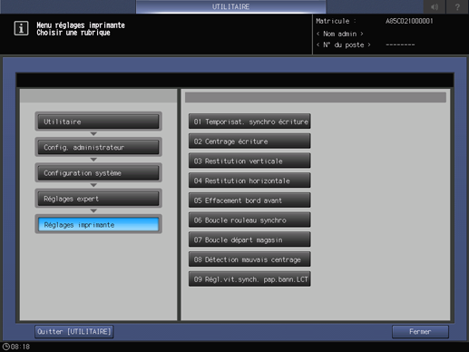 Appuyez sur [Configuration système] dans le [menu Réglage administrateur] et appuyez consécutivement sur [Réglages expert], [Réglages imprimante] et [Restitution verticale].