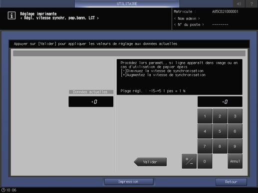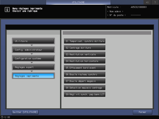 Appuyez sur [Configuration système] dans le [Menu Réglage administrateur] et appuyez consécutivement sur [Réglages expert], [Réglages imprimante] et [Régl.vit.synch. pap.bann.LCT].
