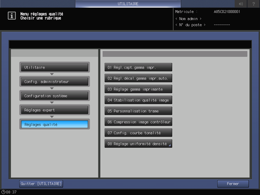 Appuyez sur [Configuration système] dans le [Menu Configuration administrateur] et appuyez consécutivement sur [Réglages expert], [Réglage qualité] et [Réglage gamma imprimante].