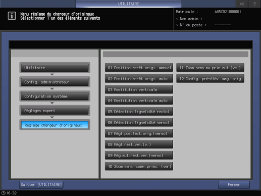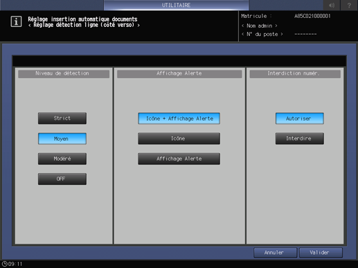 Appuyez sur l'onglet [Configuration système] de l'écran [Menu fonctions administrateur] et appuyez successivement sur [Réglages expert], [Réglage chargeur d'originaux] et [Détection ligne(côte verso)].
