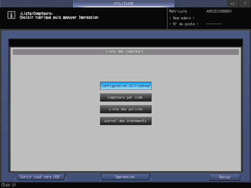 Appuyez sur l'onglet [Configuration système] de l'écran [Menu Réglage administrateur] et appuyez sur [Liste des compteurs].