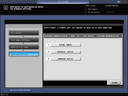 Appuyez sur l'onglet [Ident. utilisateur/Compte] de l'écran [Menu Réglage administrateur], puis appuyez consécutivement sur [Régl.auth.utilis.] et [Configuration gestion].