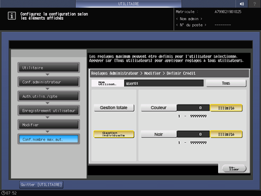 Appuyez sur [Définir limite max.] pour afficher l'écran [Définir limite max.]. Entrez la limite maximum au clavier. Si vous appuyez sur [Annuler], la valeur est réinitialisée et la limite maximum n'est pas définie. Sélectionnez [Tout modifier] pour appliquer les réglages actuels à tous les utilisateurs.