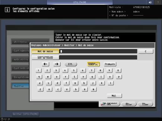 Appuyez sur [Mot de passe] pour afficher l'écran [Mot de passe]. Entrez un mot de passe de votre choix. Appuyez sur [Confirmation de saisie mot de passe], retapez le même mot de passe et appuyez sur [Valider]. Vous pouvez entrer un maximum de 64 caractères à un octet pour le mot de passe utilisateur.