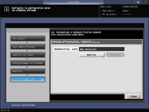 Pour enregistrer une nouvelle carte IC, appuyez aussi sur [Modifier] et passez la carte IC sur l'unité d'authentification.