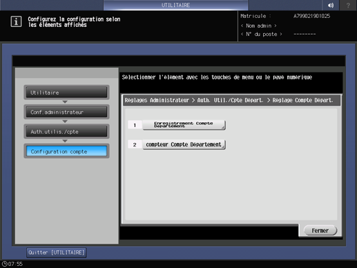 Appuyez sur l'onglet [Auth.utilis./cpte] de l'écran [Menu fonctions administrateur], puis appuyez consécutivement sur [Configuration compte] et [Compteur Compte Département].