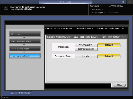 Sélectionnez s'il faut ou non autoriser [Impression] et [Récupérer Scan] pour lesquels une authentification n'est pas requise.