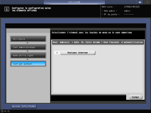 Appuyez sur l'onglet [Auth.utilis./cpte] de l'écran [Menu Configuration administrateur] et appuyez consécutivement sur [Conf. pér. authent.] et [Configuration générale].