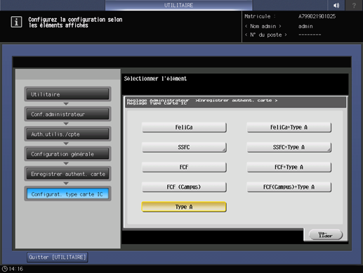 Appuyez sur [Authentification par carte IC] et sur [Configurat. type carte IC] et sélectionnez la carte IC à utiliser.