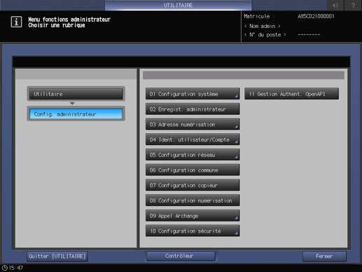 Suivez la procédure consignée dans Config. administrateur pour afficher l'écran [Menu fonctions administrateur].