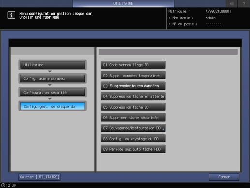 Appuyez sur l'onglet [Configuration sécurité] de l'écran [Menu Réglage administrateur] et appuyez consécutivement sur [Gestion disque dur] et [Suppr. données temporaires].