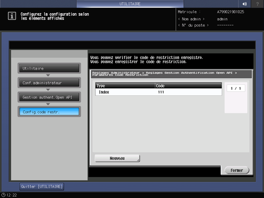 Appuyez sur [Gestion authent.Open API] sur l'écran [Menu Config. administrateur] et appuyez sur [Paramètres Code Restriction].